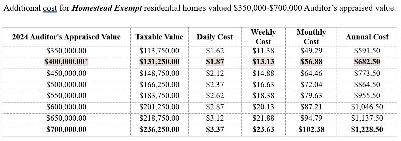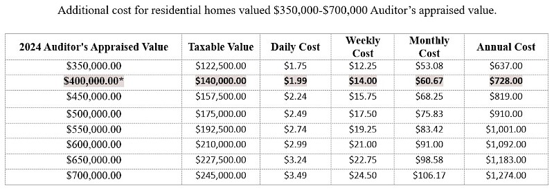 * Median Home Value for Brown Twp. in 2024 was $416,700 according to the Franklin County Auditor Information Sources: Click HERE for information and eligibility for the Homestead Exemption. Click HERE to check the Auditor’s appraised value for your property. To calculate your proposed additional annual cost, use the following formula: Proposed Additional Annual Cost = (Your home’s Auditor’s Appraised Value) x 0.35 x 0.0052 |