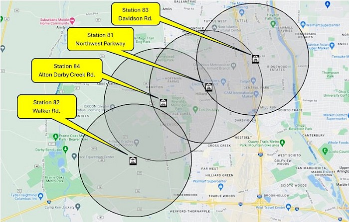 Service area of each Norwich Township Fire Department station (Sta 84 opens June 2025).